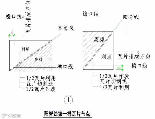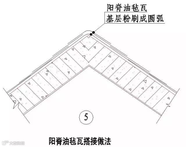 8)铺设油毡瓦脊瓦时,脊瓦与脊瓦之间的搭盖应保证压盖后外露面为油毡瓦有效外露面(见图4、5) 。