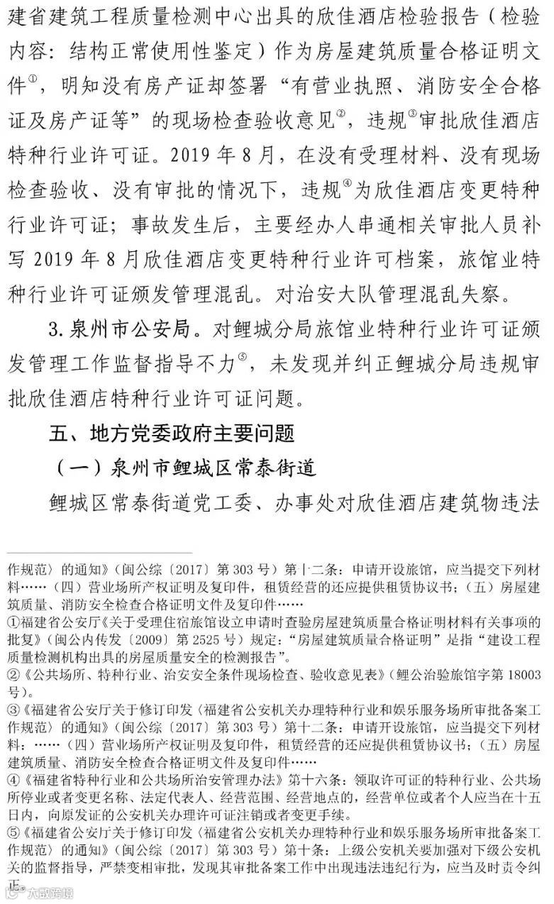 福建省纪检监察机关对该起事故中存在失职失责问题的41名公职人员给予党纪政务处分,1人予以诫勉。其中:省管干部9人、泉州市管及以下干部33人;主要领导责任14人、重要领导责任5人、监督责任2人、直接责任21人;厅级干部7人、处级干部13人、其他22人。