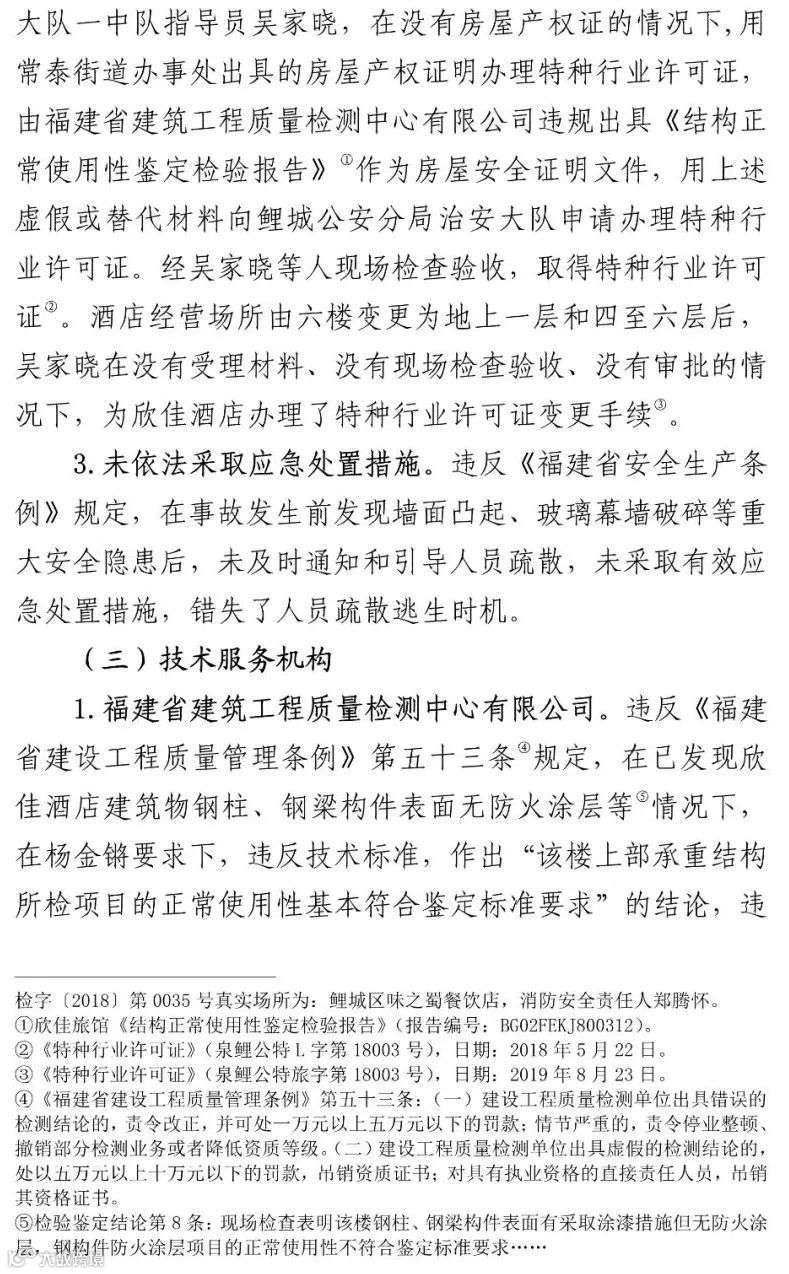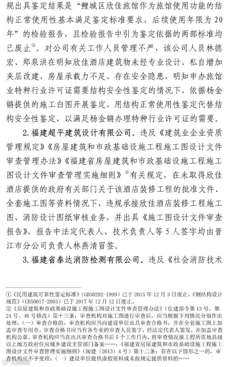 福建省建筑工程质量检测中心有限公司、福建超平建筑设计有限公司、福建省泰达消防检测有限公司、福建省亚厦装饰设计有限公司、湖南大学设计研究院有限公司违规承接业务,出具虚假报告,制作虚假材料帮助事故企业通过行政审批。