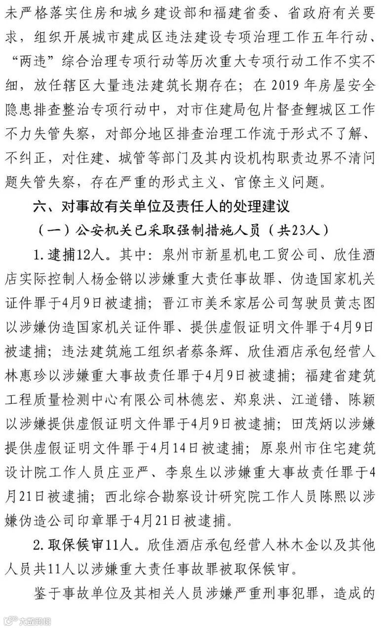 欣佳酒店实际控制人、承包经营人、违法施工组织者、设计/勘察/检测单位等12人被逮捕,11人取保候审,49名公职人员受处分,其中7人移送司法。