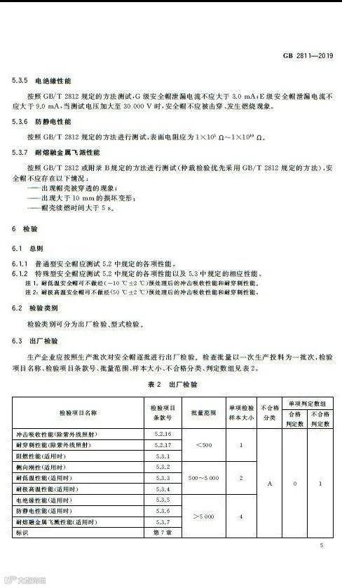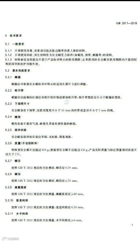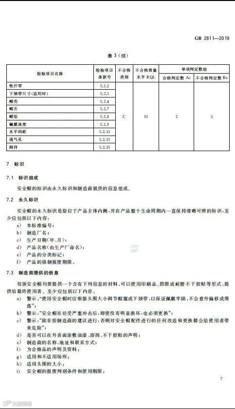 新版的GB2811-2019规定,在安全帽内侧,全生命周期内必须清晰保持以下6项标识: