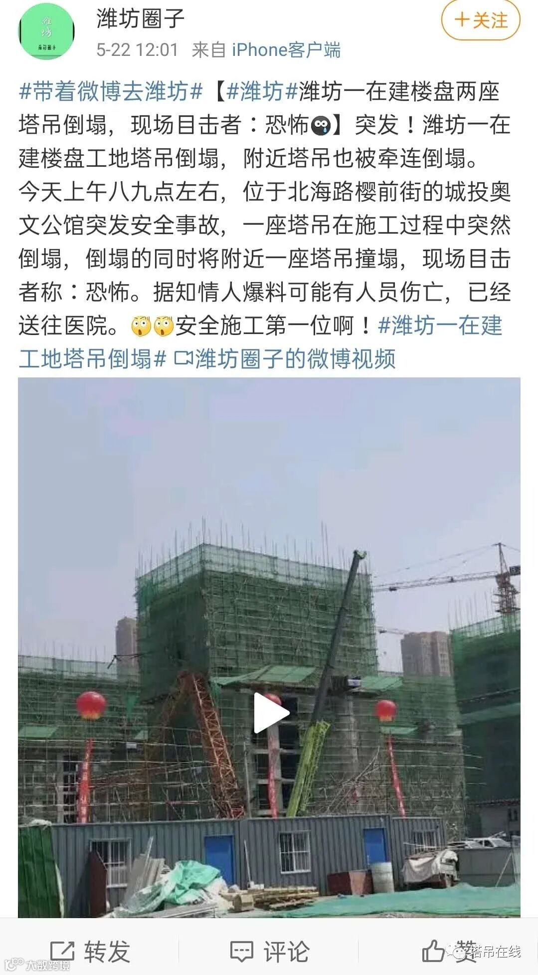 据网友爆料:2020年5月22日山东潍坊一在建楼盘两座塔吊倒塌,现场目击者称,附近塔吊也被牵连倒塌,今天上午八九点左右,位城投奥文公馆突发安全事故,一座塔吊在施工过程中突然倒塌,倒塌的同时将附近一座塔吊撞塌于北海路樱前街的,现场目击者称:恐怖。据知情人爆料可能有人员伤亡,已经送往医院。