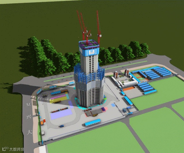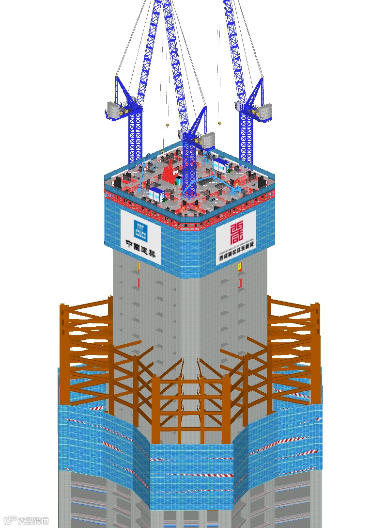 1、空中造楼机,可从地面自动爬升至结构高度479.7米,解决高空作业安全和作业面问题。