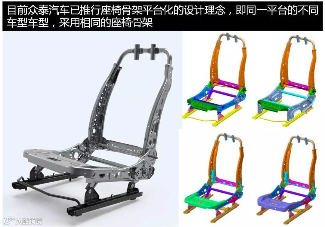 座椅骨架结构轻量化是在不影响骨架的性能、舒适性、功能等前提下,对座椅骨架的尺寸、结构等进行设计优化,以达到减重的目的。目前众泰汽车已推行座椅骨架平台化的设计理念,即同一平台的不同车型车型,采用相同的座椅骨架。