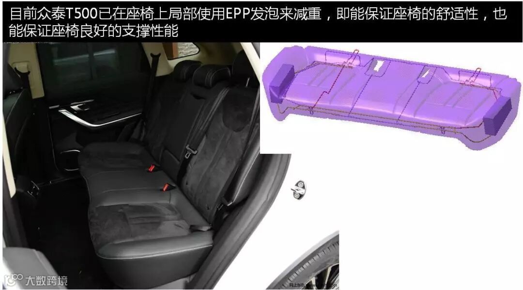 整车座椅除了骨架占的重量比重最大外,其次就是座椅的泡沫了,1台车的座椅泡沫总重有将近10kg左右,所以座椅泡沫的轻量化也很重要。EPP发泡相对较轻,且有良好的缓冲性能和支撑性能,可以代替座椅上部分的PUR发泡,起到减重的作用。目前众泰T500已在座椅上局部使用EPP发泡来减重,即能保证座椅的舒适性,也能保证座椅良好的支撑性能。后续新开发的车型在保证座椅舒适性的前提下也在逐步考虑此减重方案。