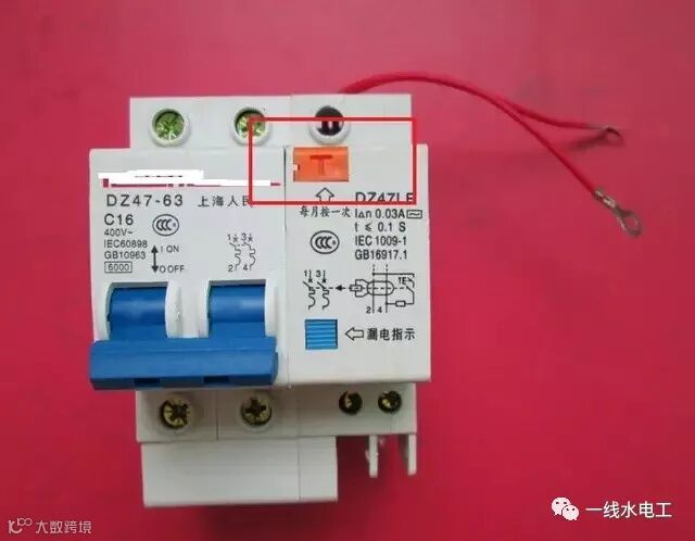 其次,漏电开关上附有明显的“T”字测试按钮,如下图所示,而空气开关没有。