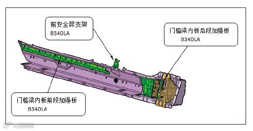 低合金高强钢板即BLa钢板,如B340LA(440)、B410LA(590)等,是在低碳钢中添加少量的铌或钛合金元素,使其与碳、氮等元素形成碳化物和氮化物,并在铁素体上析出,从而提高钢的强度。这种钢板具有良好的成形性和较高的强度,可用于制造一些强度要求比较高的结构件和加强件等,例如门槛梁内板加强板、门内板加强板、悬置安装支座、副车架连接座内板和门铰链加强板等。图2所示的某车型门槛梁内板前/后段加强板和前安全带支架就采用了B340LA低合金高强钢板。