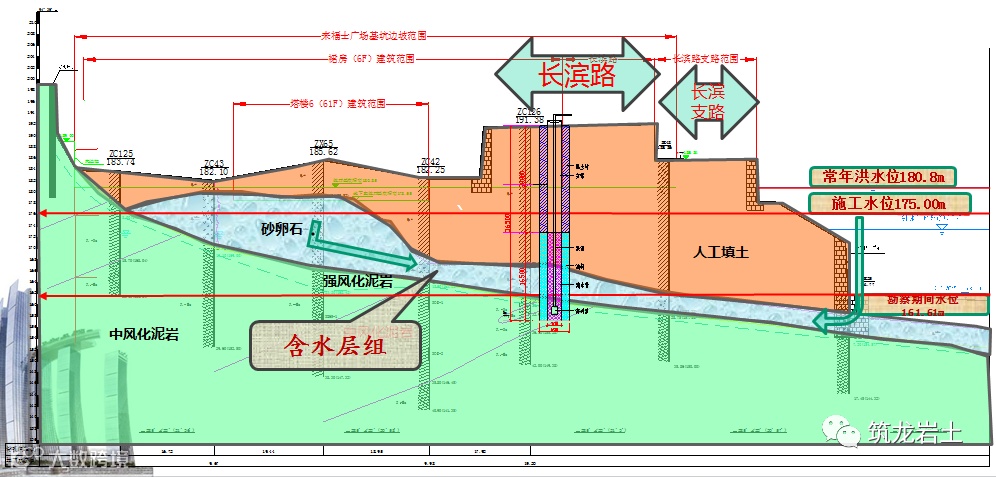 本工程地理位置特殊,距离长江最近仅20m,桩基础施工期间要跨越长江洪水期,蓄水期。水位高度长期在175m左右,而桩底标高平均在155m左右,地下水水头高于桩底标高约20m。且场区地质条件复杂,土质条件主要以杂填土层、砂卵石层组成,极易发生塌孔、涌水、流砂,桩基施工安全风险大。