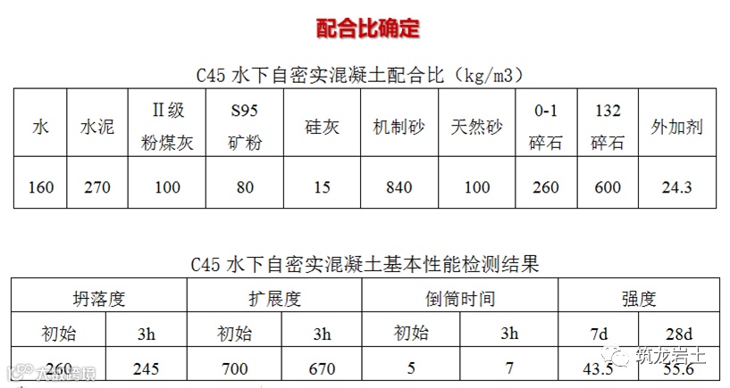 为满足混凝土大扩展度、高流动性、初凝时间、经时损失等性能要求,携手中建商砼,对混凝土配合比进行设计,研发一种坍落度可达260 mm~ 280mm、扩展度可达700mm ~ 750mm、两小时经时损失为零、初凝时间达10h±2h的超大流态C45水下自密实混凝土。