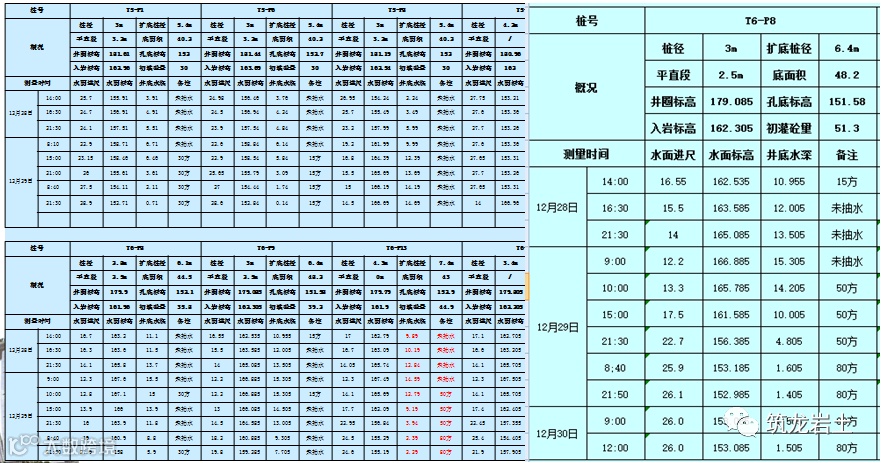 据现场统计,成孔后在未抽水的情况下,桩底积水标高与江面齐平,积水深度达15米。采用80t/h的水泵抽水,无法将叶轮标高以下积水抽干,停止抽水后,桩内的涌水量可达60立方米/小时。