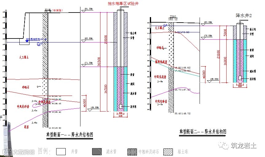 1、降水井深度进入底部基岩6.00m,保证水体的汇集及深井泵的抽排。成孔口径800mm,滤水管管径300mm