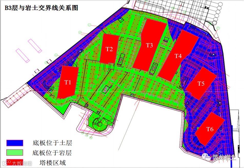 场地总的趋势为南边及中间高,北侧及东、西两侧低,基岩面总体上由东向西倾斜;场地基岩划分为强风化带及中等风化带,基岩面最低点位于场地东侧,标高为 155.19m,最高点在场地中南部,标高为 207.5m, 相对高差为 50m 左右。