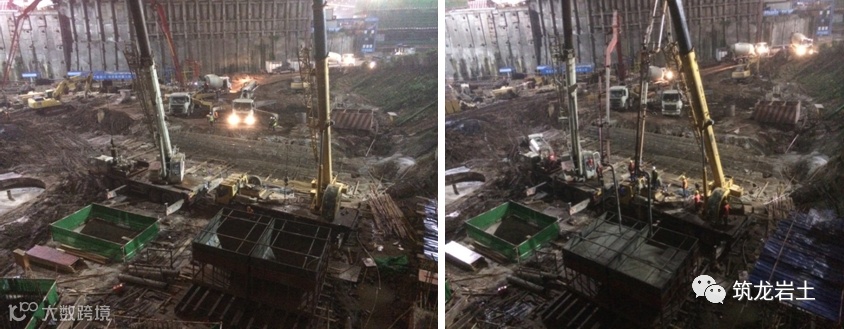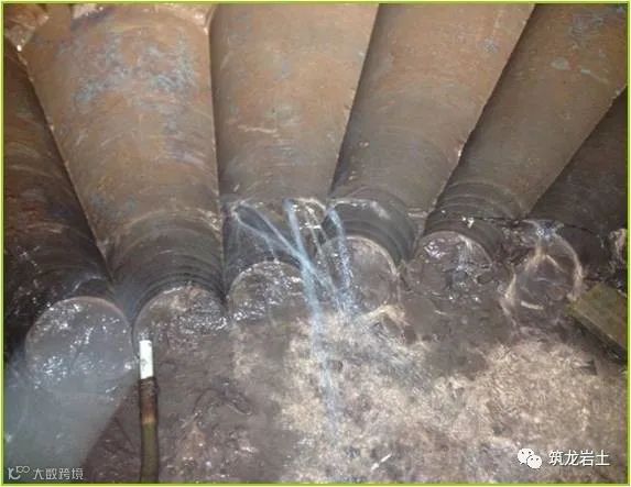 降水帷幕对土层及砂卵石层段地下水进行了有效的治理,基岩段可在底部设置抽水井内排的方式确保桩基顺利成孔,但成孔后,因桩底涌水量及基岩裂隙水过大,需采用水下混凝土灌注方式施工。