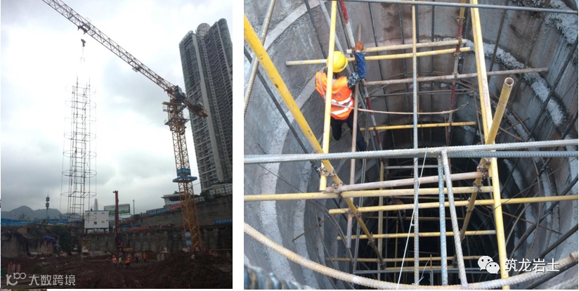 钢筋笼纵向每隔3米设置一道加强环,外层加强环设在外层主筋外侧,内侧加强环设在内层主筋内侧。极少数外层纵筋与外层加强环焊接成型,内层加强环采用铁丝绑于外层加强环,形成钢筋笼骨架。骨架成型后,采用25T汽车吊辅助塔吊对骨架进行竖立,最后采用塔吊将竖立的骨架吊入孔内。