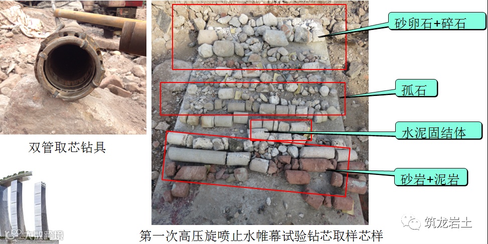 第二次高压旋喷注浆止水帷幕咬合点砂卵石层未形成固结体,砂卵石为松散状态。