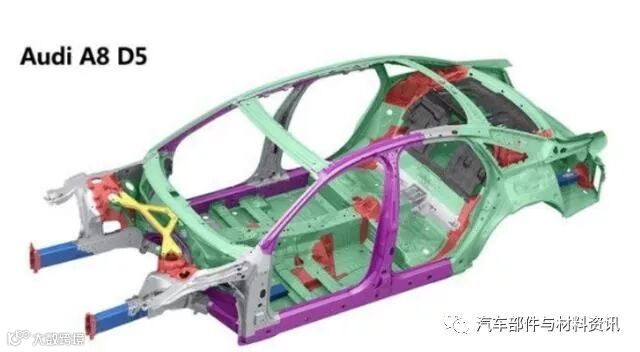 首先需要明确的是,全铝不是纯铝,这里的全铝车身指的是车身中部分采用铝合金材质,而其中还是有其他材质的部件。比如奥迪A8的AFS全铝车身,其铝合金用量只占58%,B柱使用的是热成型高强度钢,但仍然能被称为全铝车身。