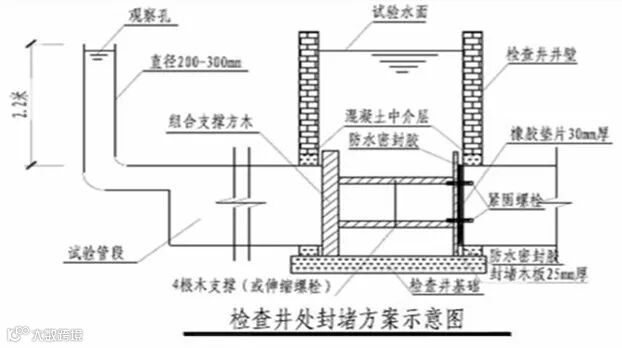 3、将水灌至规定水位后开始记录,观察测定时间不少于30分钟,检查管道接口是否有渗水痕迹并计算渗水量,不超过对应管径的允许渗水量即为合格。