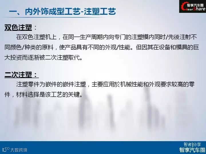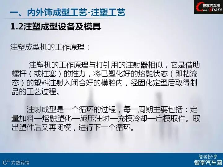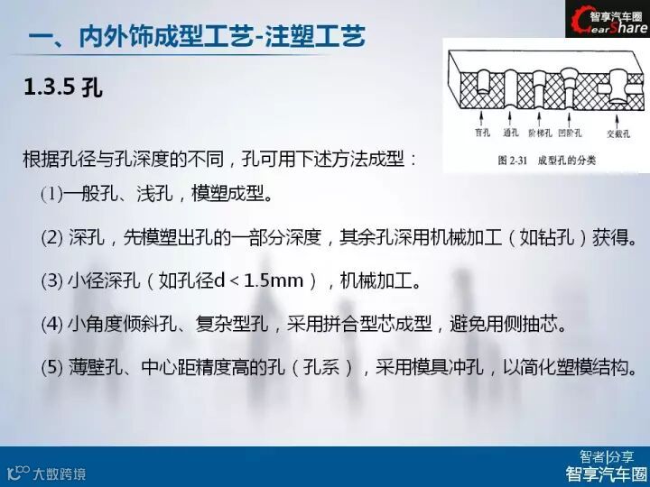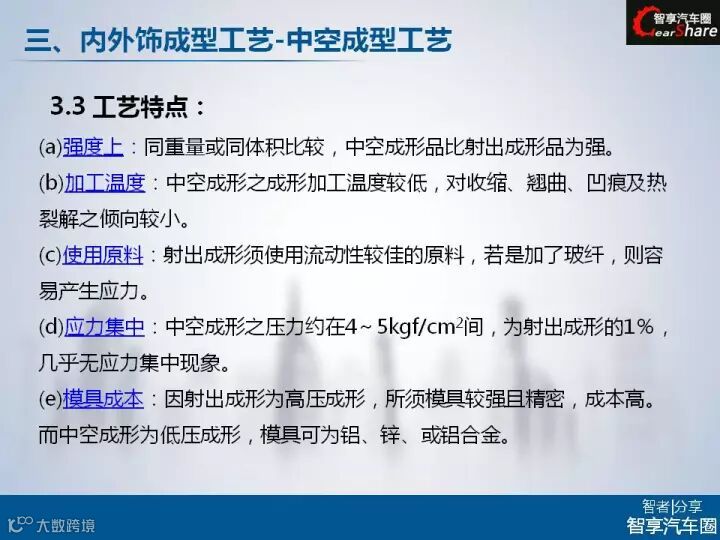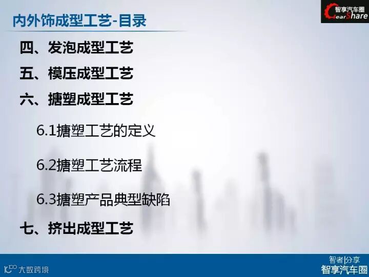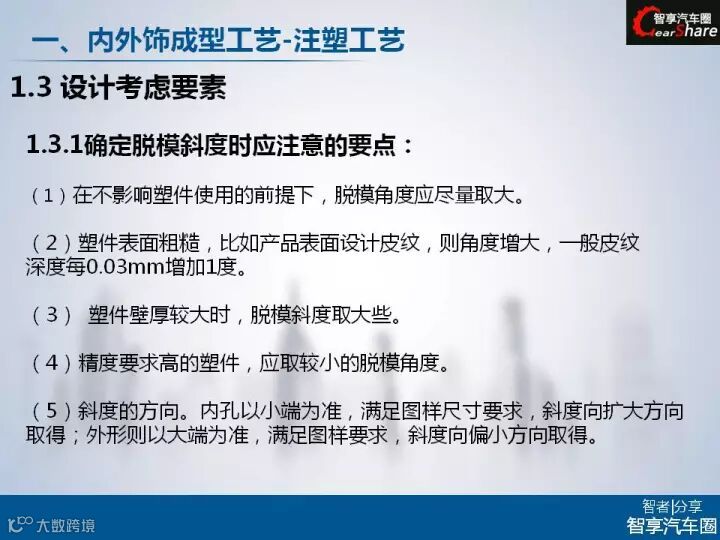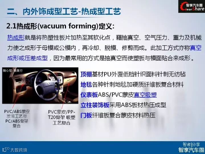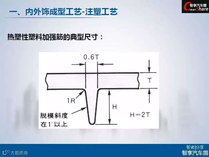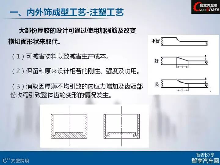 本文用68页PPT,结合多年内外饰从业经验,阐述注塑成型、热成型、中空成型、发泡成型、模压成型、搪塑成型、挤出成型等7大工艺的设计要点及关键参数,希望与相关同行们一起探讨,学习,提高!