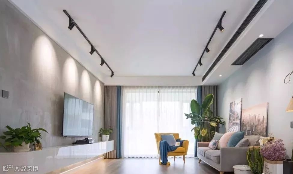 客厅的电视背景墙没有另外刷漆,只是简单的装个吊柜,有一点工业风的感觉。
