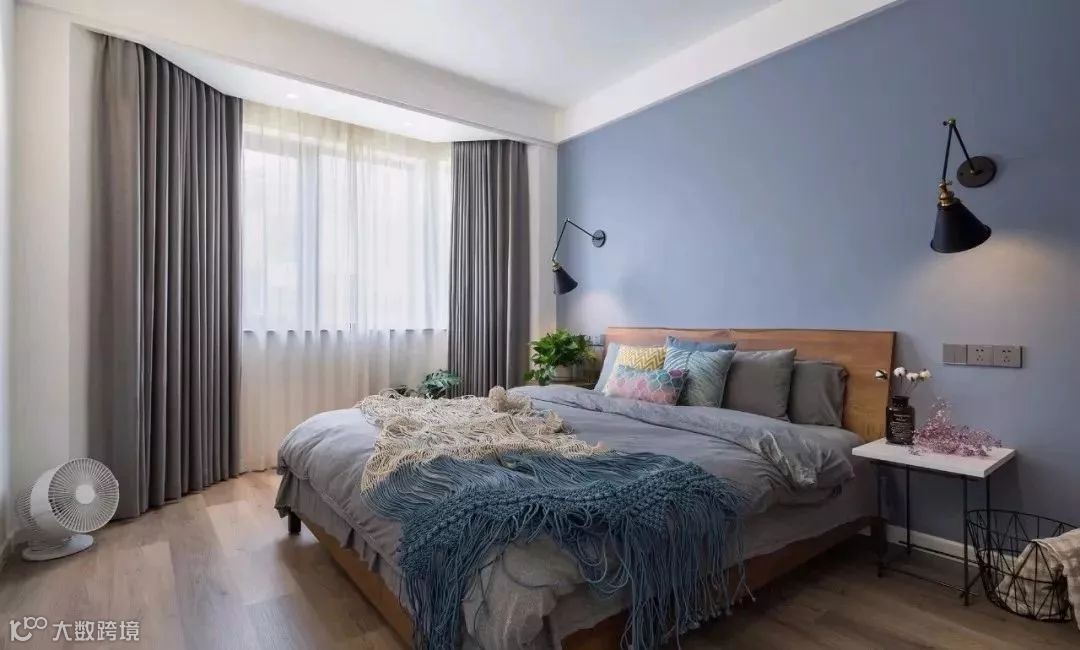 由于蓝色有助于睡眠,所以装修的时候果断选了蓝灰色的背景。整体效果不错。
