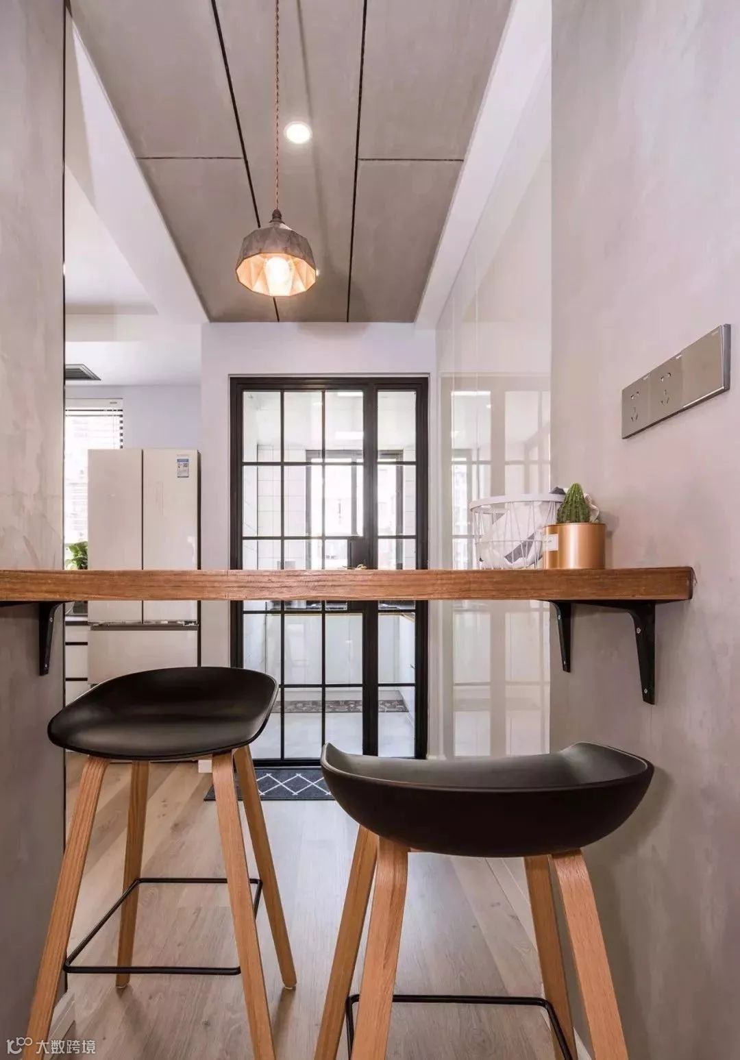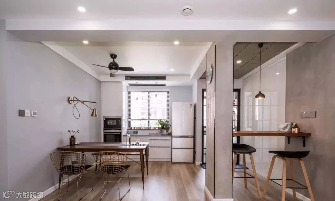 厨房进行了大改造,将原本的厨房空间砍半,并入到餐厅中。但因为餐厨间有跟承重柱不能敲掉,只好刷上水泥漆、包上防护条,隔出一个吧台。