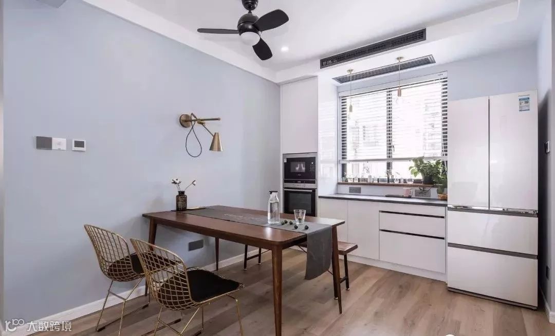 厨房与餐厅用黑框玻璃门隔开,透明隔断,有助于延伸空间视觉感。