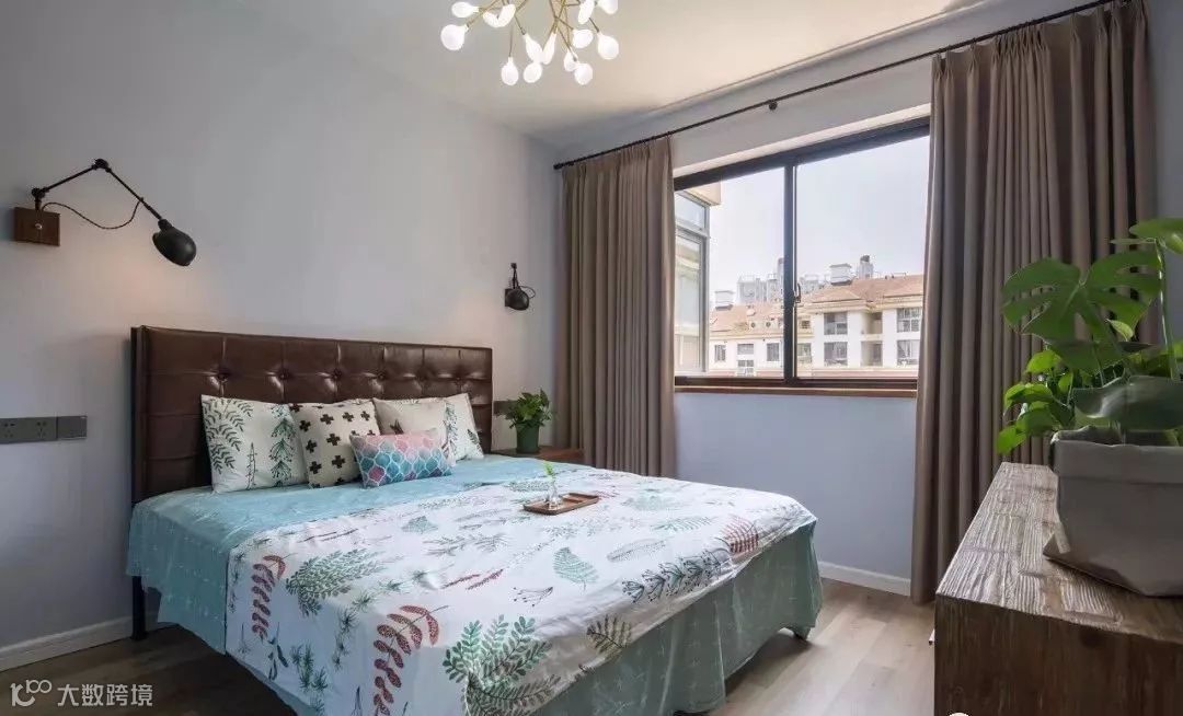 次卧面积虽然小,但是采光一级棒。浅色墙面漆搭配咖色调大床与窗帘,看着特别清爽。