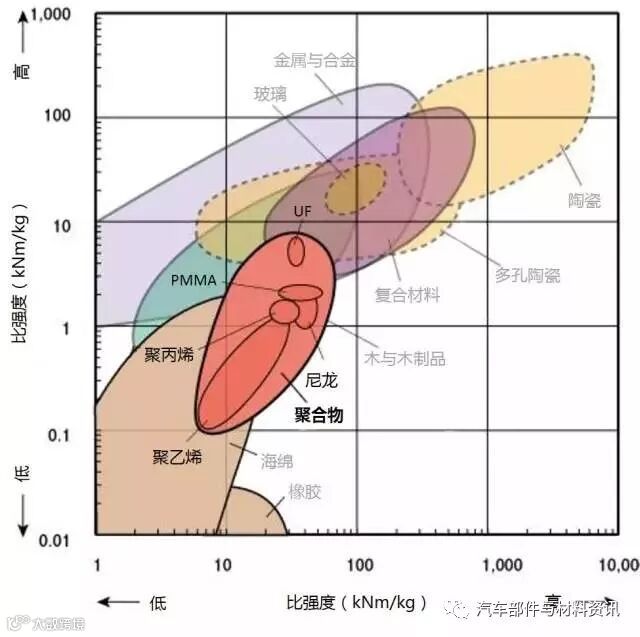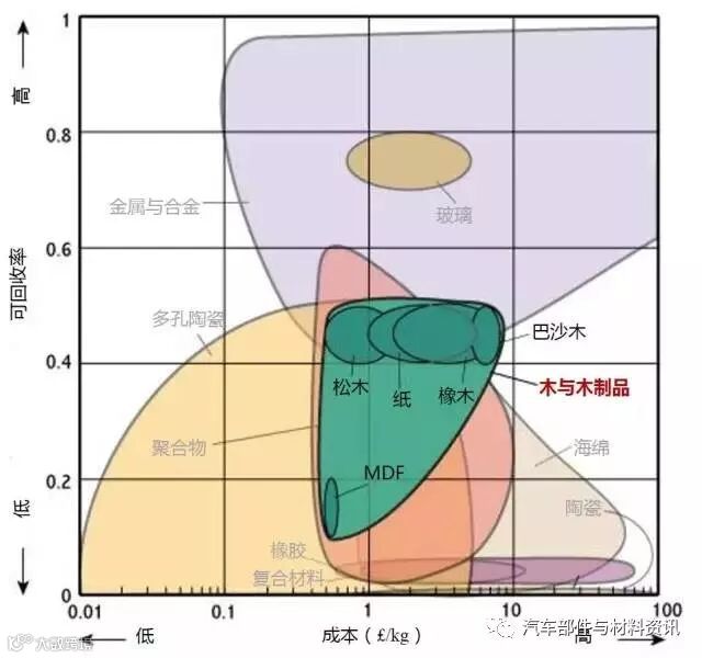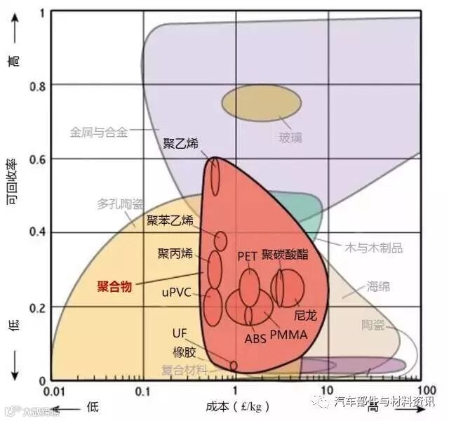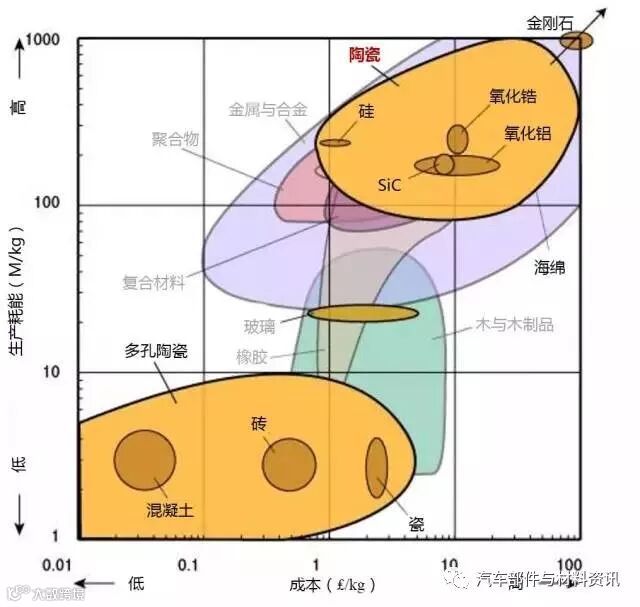 1、生产某种材料所需消耗多大的能量是原料成本的一个因素。所以是大部分材料都位于左下角(低成本/低能耗)或右上(高成本/高能耗)。