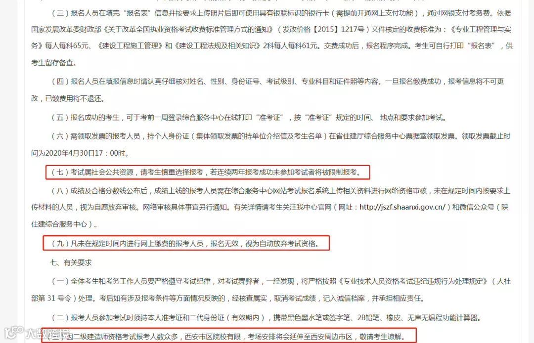 (三)因二级建造师资格考试报考人数众多,西安市区院校有限,考场安排将会延伸至西安周边市区,敬请考生谅解。