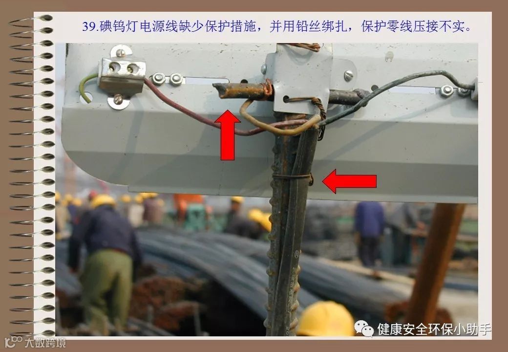 1、电源线直接和碘钨灯管接在一起2、草坪灯使用铁丝固定在角钢上,无绝缘措施