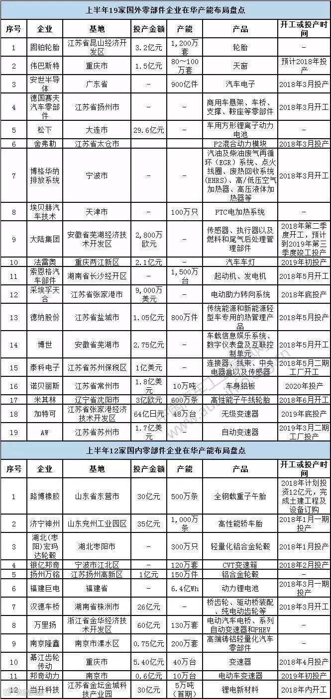 2018年上半年,31家零部件企业在华开启新一轮产能规划布局。今天,小编就为大家盘点了这些零部件企业在华的产能布局,具体详见下表。