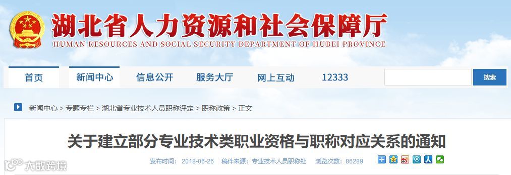 2018年6月,湖北省人社厅发布《关于建立部分专业技术类职业资格与职称对应关系的通知》。