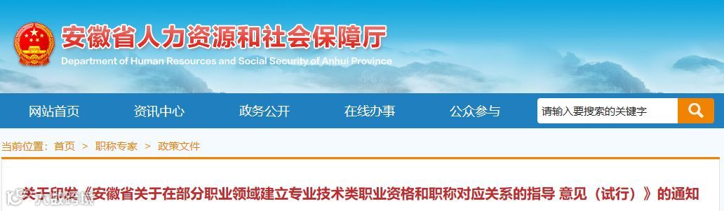 2017年12月,安徽人社厅印发《关于在部分职业领域建立专业技术类职业资格和职称对应关系的指导意见(试行)》。
