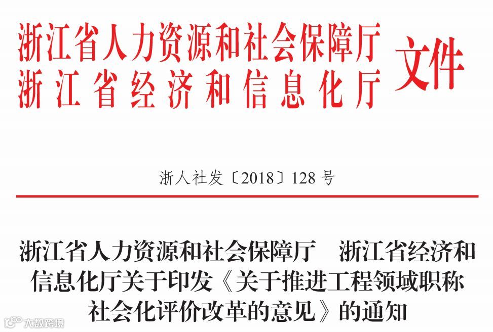 2018年12月,浙江省人社厅、经济和信息化厅联合发布《关于推进工程领域职称社会化评价改革的意见》。