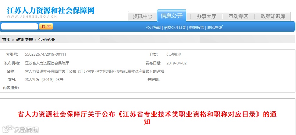 2019年3月28日,江苏省人社厅公布《江苏省专业技术类职业资格和职称对应目录》,打通职业资格和职称的对应通道。