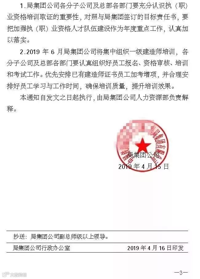 文件最后还指出,该集团公司将继续加强持证人才队伍建设,并于今年6月举办一级建造师培训班,优先鼓励已有证人员报考增项!
