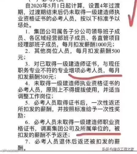 今年下半年,一份央企下发的《一级建造师资格证书取证考试管理办法》在网络上热传。《办法》要求,自2020年5月1日起,设置4年过渡期,过渡期结束后仍未取得一建证书的必考人员,扣薪、调岗、原则上不得提拔使用!