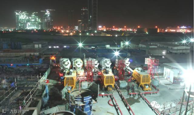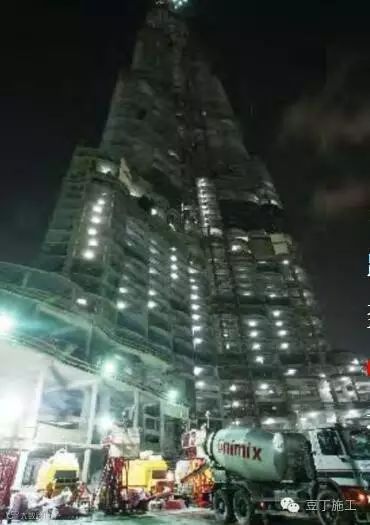 在阿联酋迪拜塔(Burj Dubai Tower)极为专业的超高层混凝土泵送一般是在晚上进行的。