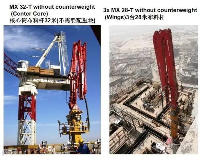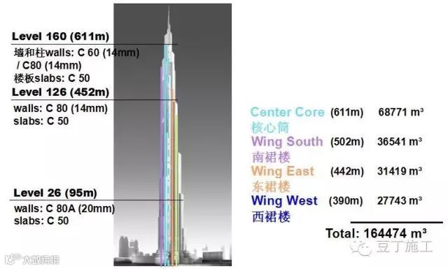 从156层起将逐步使用轻型钢结构,混凝土将泵送至位于160层的611米处。