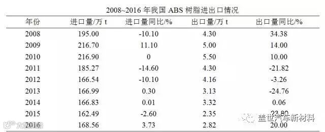 我国ABS树脂产品主要以低端通用料为主,无法满足国内高端产品的需要,每年需从国(境)外大量进口。2016年的ABS树脂进口量和出口量都比2015年略有增加。