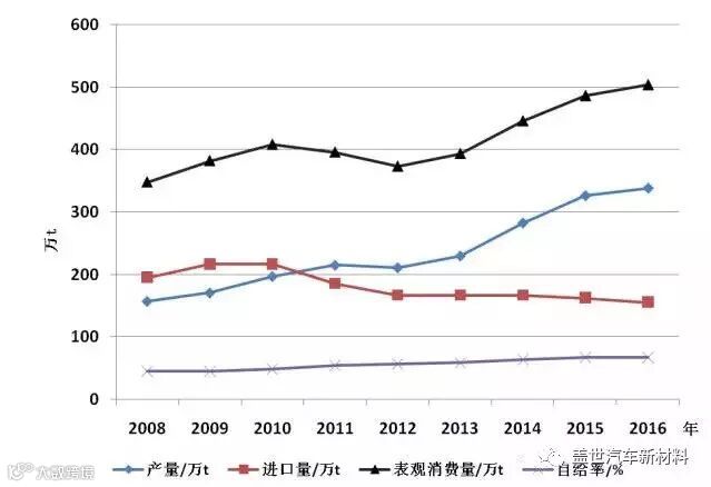 国内ABS树脂的供应包括进口和国产两部分。国产量逐年增加,尤其是2013年以后增速加剧,进口量目前呈萎缩趋势。到2016年国内产量338万吨,进口量169万吨。