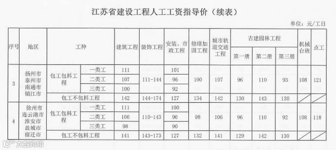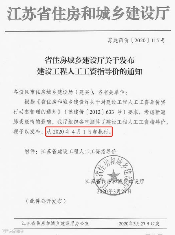 《江苏省住房城乡建设厅关于发布建设工程人工工资指导价的通知》(苏建函价〔2020〕115号)发布,自2020年4月1日起执行。同比去年,点工最高涨幅10%!