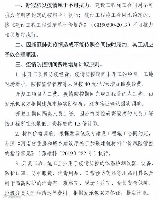 2.疫情防控期间,建设工程确需要施工的,应加强防护措施,保证人员安全,防止疫情传播,施工企业必须严格按照工程所在地政府疫情防控规定组织施工,承发包双方根据合同约定及相关规定,本着实事求是的原则协商解决,疫情防护措施、人工材料机械等导致工程价款变化,应另行签订补充协议。