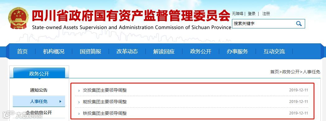 2019年12月11日,四川国资委官网发布了三则人事任免消息,分别是《交投集团主要领导调整》、《能投集团主要领导调整》、《铁投集团主要领导调整》。