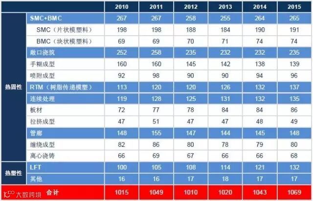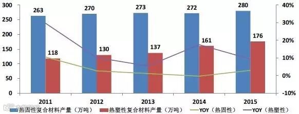中国热塑性复合材料产量快速增长,2011年到2015年间,中国复合材料总产量从381万吨增长到456万吨,增长幅度达到19.7%,其中热固性复合材料产量五年仅实现了6.5%的增长,而热塑性复合材料的产量从2010年的91万吨增长到了2015年的176万吨,增长了49%,复合增长率达到10.5%,增长势头仍十分显著。