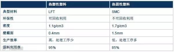 另外,玻纤增强塑料按照其加工性能可以分为热塑性(LFT)与热固性增强塑料(SMC),其中,热塑性材料不仅轻量化效果好、原料利用率高,而且更为环保,优势更大。