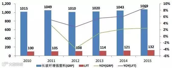 2013-2015年间欧洲玻纤增强塑料总产量年增长率在0-2%之间。但在类型众多的GRP 中,LFT 成为了行业发展的亮点。2013-2014年间欧洲LFT产量保持6%的年增长率,2015年更是达到13.2万吨,较2014 年增长9%,增长幅度远超行业总体水平。