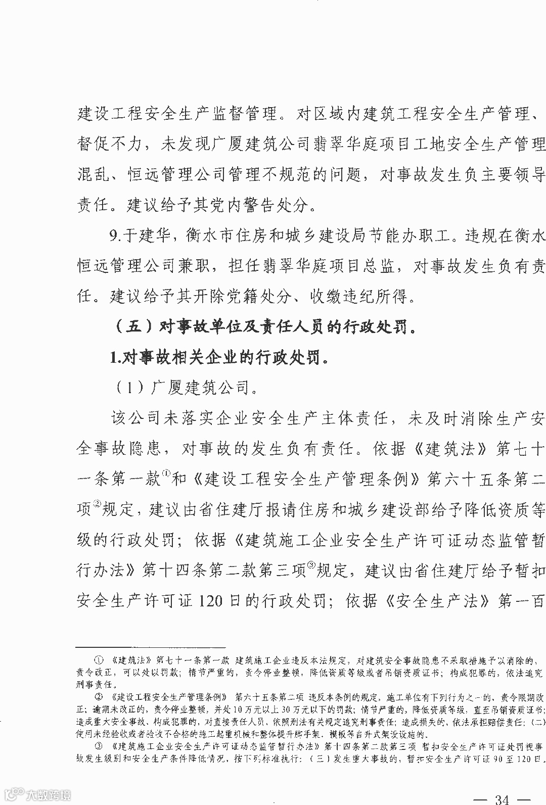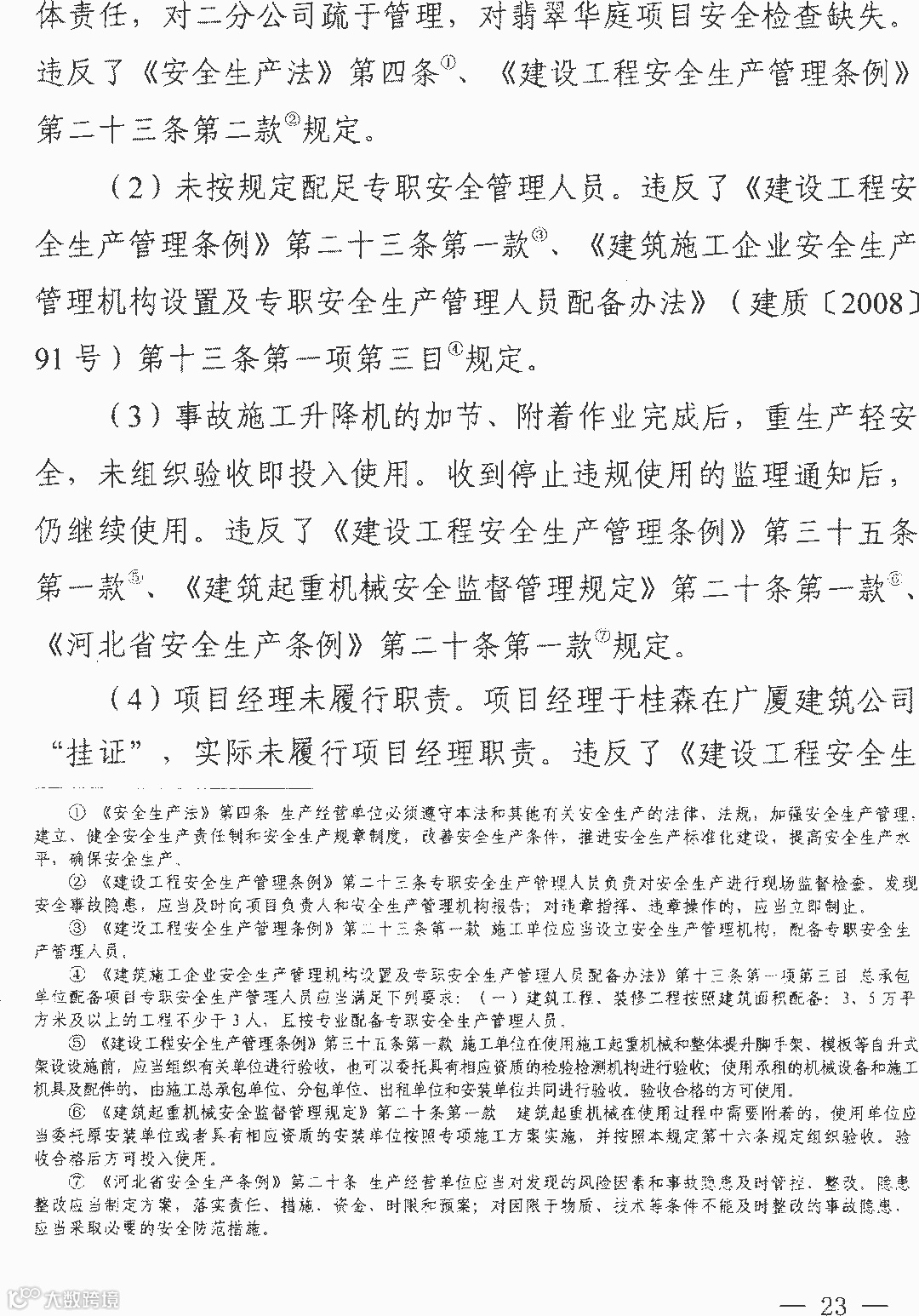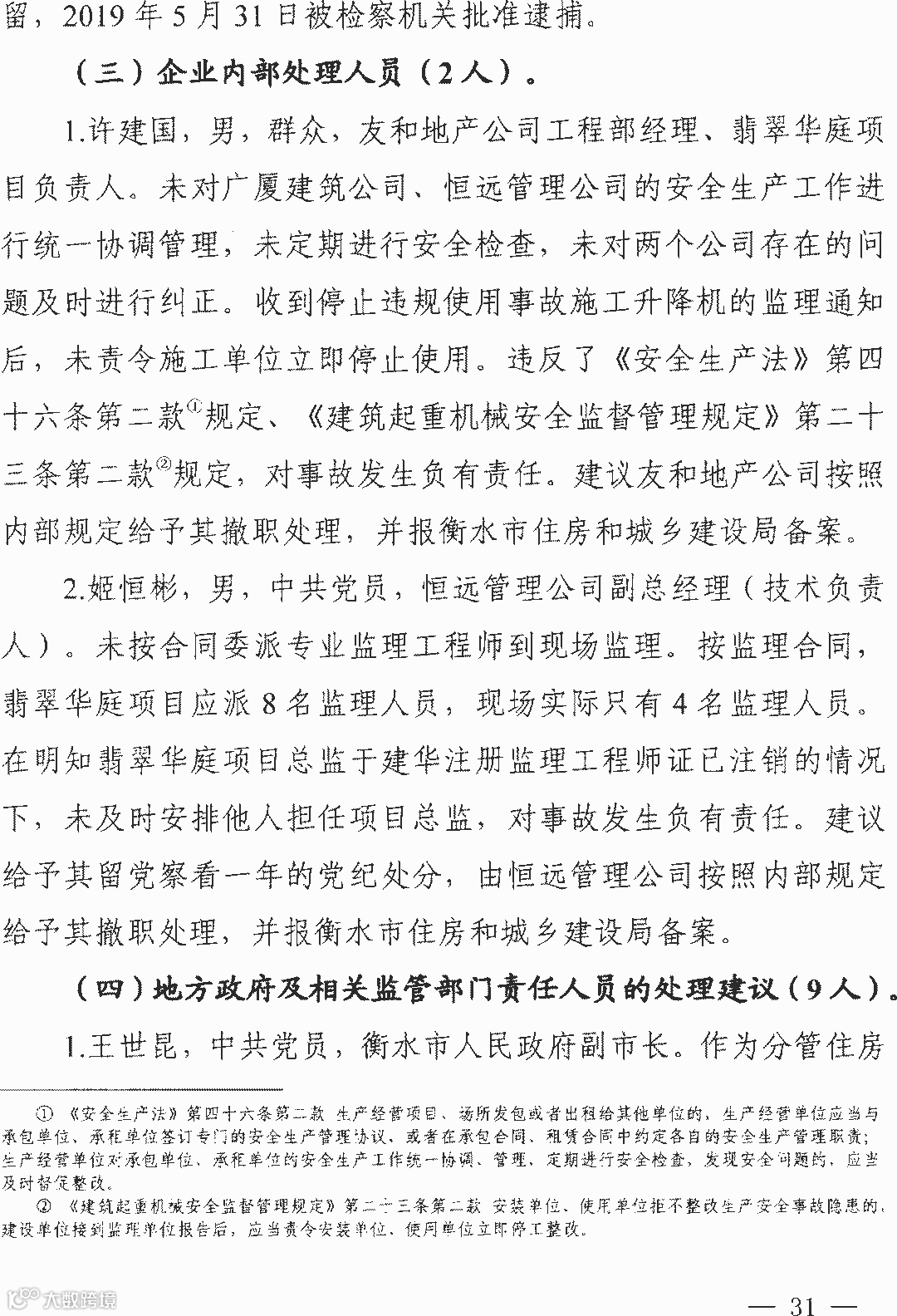 于桂森,翡翠华庭项目经理,在衡水广厦建筑公司“挂证”,建议吊销执业资格证书、终身不予注册,建议吊销安全生产考核合格证书,已被检察机关批准逮捕。