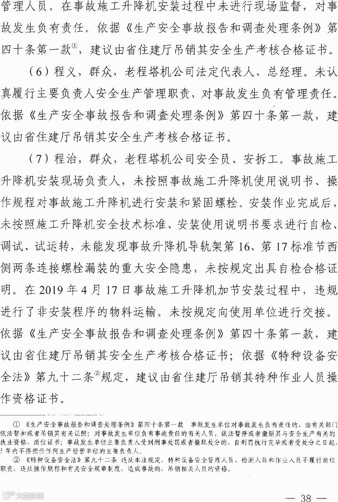 程治,安全员、安拆工,建议吊销特种作业人员操作资格证书,已被检察机关批准逮捕。