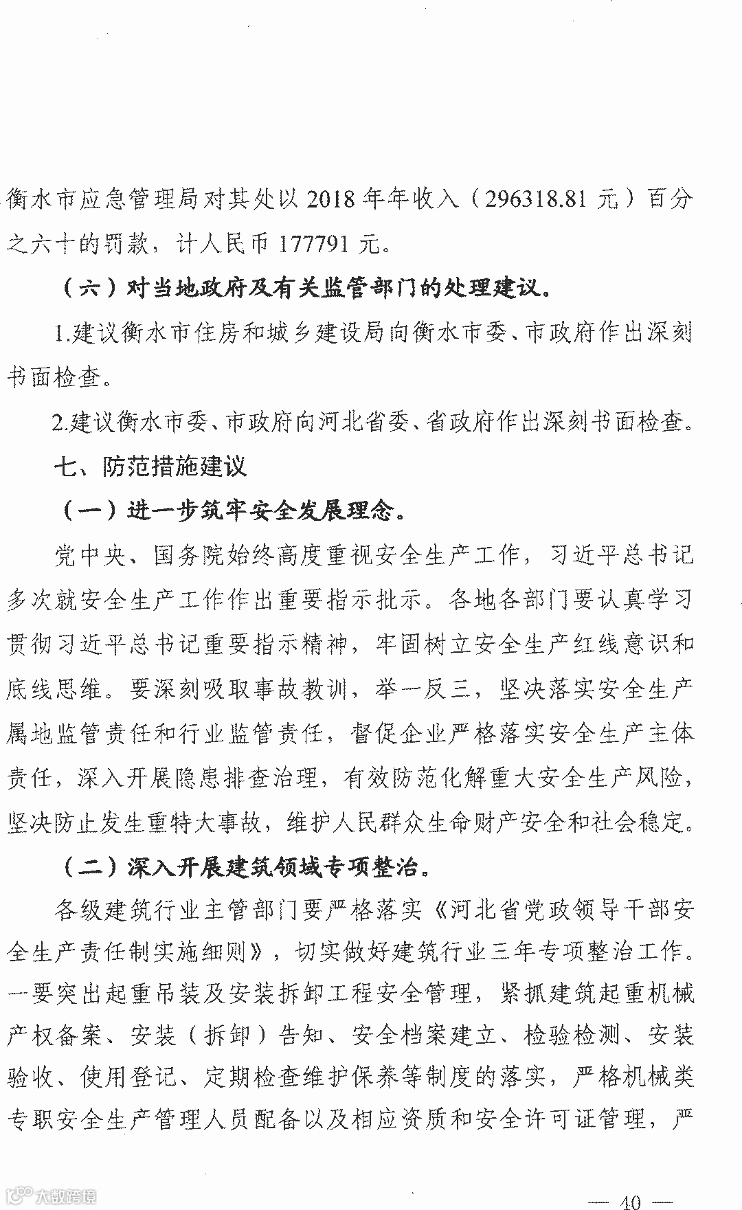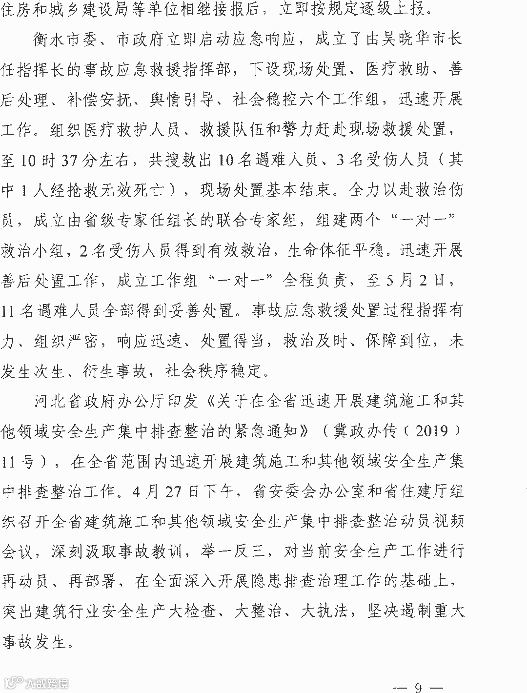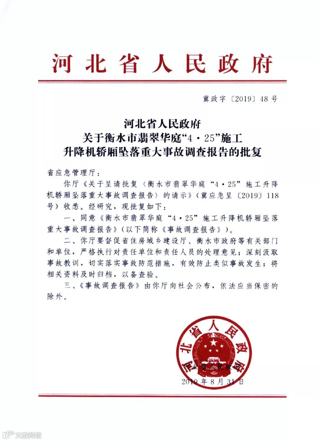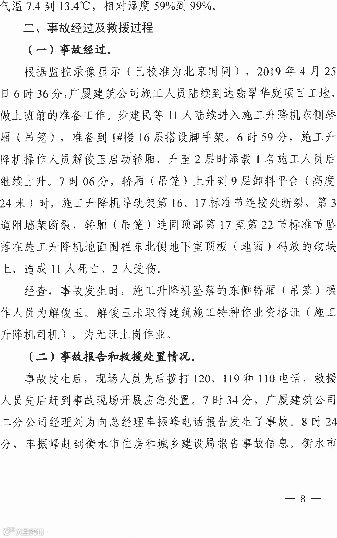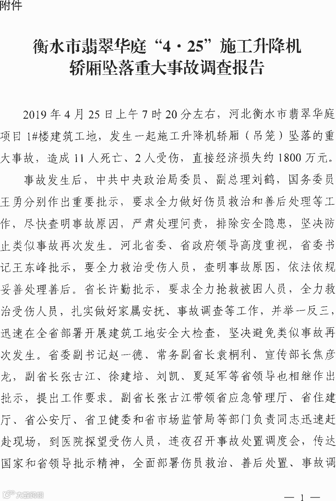 2019年4月25日上午7时20分左右,河北衡水市翡翠华庭项目1#楼建筑工地,发生一起施工升降机轿厢(吊笼)坠落的重大事故,造成11人死亡、2人受伤,直接经济损失约1800万元。